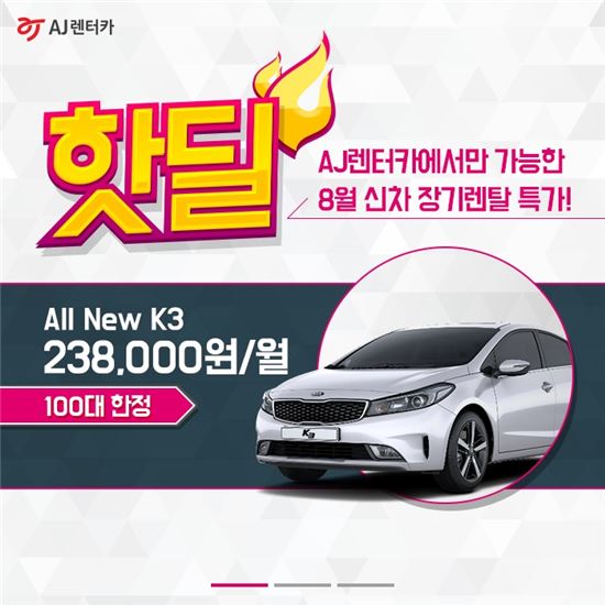 AJ핫딜장기렌터카 코너에는 매월 인기차량으로 구성된 2종의 장기렌터카가 공개된다. 특가상품으로 구성되는 만큼 상품 별로 50~100대에 한해 선착순으로 한정 판매한다. 8월 AJ핫딜은 '올 뉴 K3 1.6 디럭스 휘발유'와 '올 뉴 K7 240 프레스티지'로 선정됐다. 월 대여료는 각각 업계 최저 수준인 23만원, 36만원대(선수금 30%, 48개월 기준)다. 견적 상담을 요청한 모든 고객에게 단기렌터카 50% 할인쿠폰을 제공하며 차량 계약고객 전원에 블랙박스, 내비게이션, 고급 썬팅도 무료로 제공한다. AJ핫딜은 장기렌터카 전용홈페이지서 확인할 수 있다.