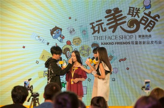 더페이스샵은 지난 12일 중국 북경 W호텔에서 각 매체 기자, 중국 유명 뷰티블로거인 왕홍 등 100여명을 초대해 론칭 행사를 진행했다. 이 날 행사장에는 카카오프렌즈 캐릭터 특징을 살린 실내 연출물과 함께 제품을 직접 체험할 수 있는 공간이 마련됐다.