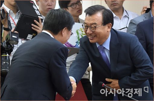 [아시아경제 윤동주 기자] 이정현 새누리당 대표가 17일 서울 여의도 당사에서 열린 최고중진연석회의에 참석, 중진의원들과 인사를 나누고 있다.