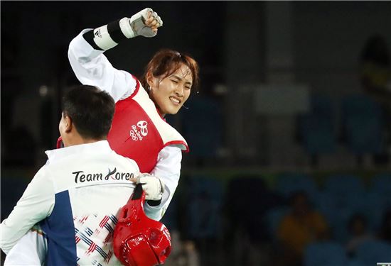 [리우데자네이루=연합뉴스] 17일(현지시간) 브라질 리우데자네이루 바하 카리오카 경기장 3에서 열린 2016 리우올림픽 태권도 여자 -49kg급 결승전에서 한국 김소희가 세르비아 티야나 보그다노비치를 상대로 승리해 기뻐하고 있다.