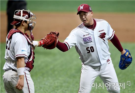 [아시아경제 김현민 기자]프로야구 삼성 라이온즈와 넥센 히어로즈의 2016 KBO리그 경기가 21일 서울 고척스카이돔에서 열렸다. 넥센 마무리 김세현이 2-0 승리를 확정한 뒤 박동원 포수와 기쁨을 나누고 있다.