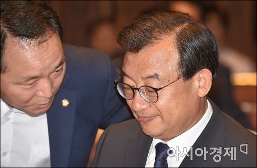 [아시아경제 윤동주 기자] 이정현 새누리당 대표가 22일 서울 여의도 국회에서 열린 의원총회에 참석, 회의 시작 전 보고를 받고 있다.