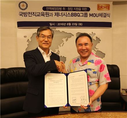 이날 행사에는 윤홍근 제너시스 BBQ 회장을 비롯해 신만택 국방전직교육원장, 윤희철 교육운영부장 등이 참석해 전역예정장병의 안정적인 취·창업의 보장과 일자리 창출을 위한 장기적인 협력 관계를 맺었다.