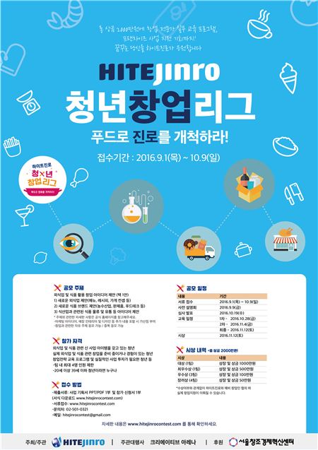 [아시아경제 이주현 기자]하이트진로가 9월1일부터 10월 9일까지 약 6주간 전국 2030 청년들을 대상으로 ‘외식업 및 식품 창업 활용 아이디어 공모전’을 개최한다고 24일 밝혔다.
