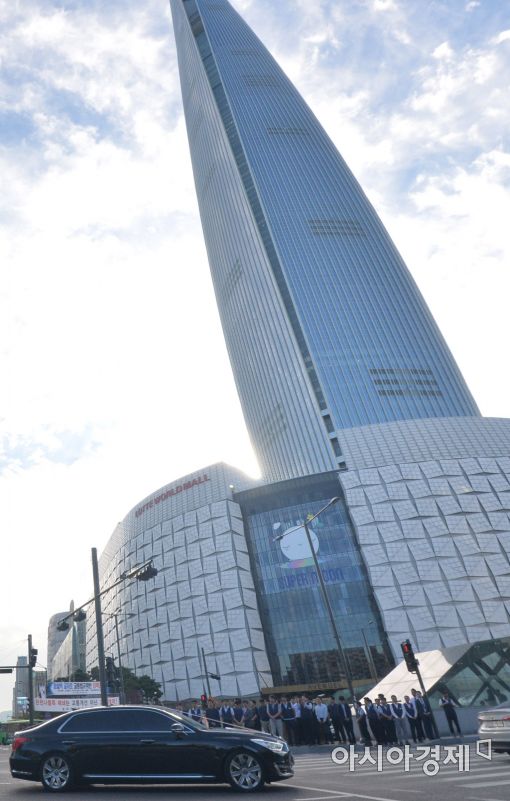 [아시아경제 문호남 인턴기자] 故 이인원 롯데그룹 부회장의 운구차량이 30일 서울 송파구에 위치한 그룹의 상징인 롯데월드타워를 경유하고 있다. 운구차량은 서울 추모공원으로 이동해 화장 후 장지인 남양주 모란공원으로 향한다.