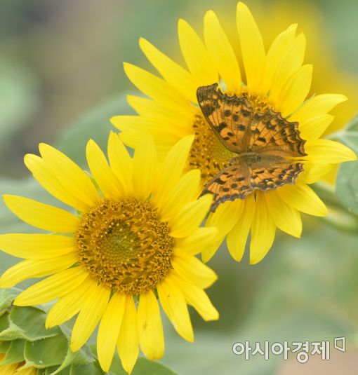 [아시아경제 문호남 인턴기자] 선선한 초가을 날씨를 보이고 있는 30일 서울 마포구 하늘공원에서 호랑나비가 활짝 핀 해바라기에 앉아 있다.