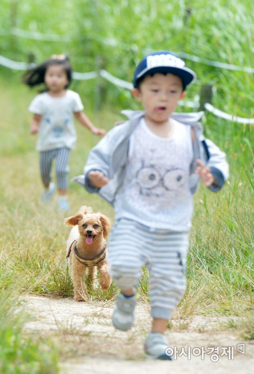 [아시아경제 문호남 인턴기자] 선선한 초가을 날씨를 보이고 있는 30일 서울 마포구 하늘공원을 찾은 어린이들이 강아지와 즐거운 시간을 보내고 있다.