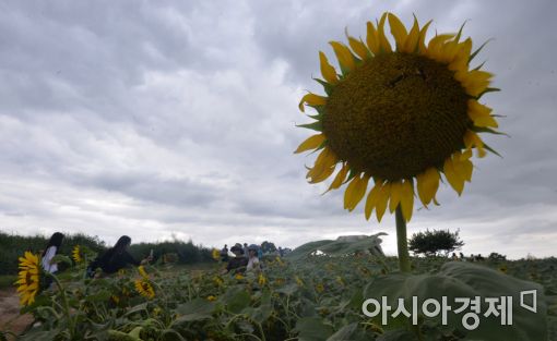 [아시아경제 문호남 인턴기자]연일 이어지던 맑은 날씨가 사라지고 짙은 구름이 몰려오고 있는 가운데 30일 오후 서울 마포구 하늘공원의 해바라기 뒤로 먹구름이 드리우고 있다.