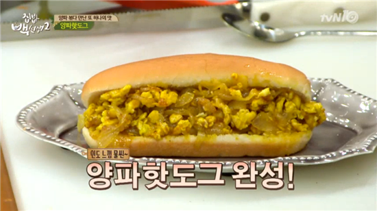 이어서 공개한 양파 핫도그는 더 군침이 돌게 만들었다. 캐러멜화가 완전히 진행된 양파와 달걀 스크램블을 섞은 후 카레가루 2숟갈을 더해 속 재료를 만들었다. 이후 핫도그 빵을 전자레인지에 15초 정도 데우고 속 재료를 넣어 완성했다. 말 그대로 초 간단 레시피였다.