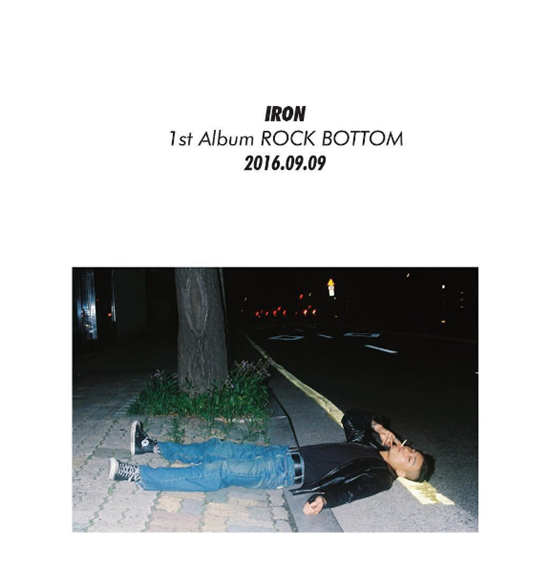 인스타그램에 게재된 사진에는 “IRON 1st Album ROCK BOTTOM 2016.09.09”라는 문구와 함께 아이언이 가죽 재킷을 입은 채 길거리에 누워서 담배를 피우고 있는 모습이 담겨 있다.