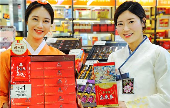 [아시아경제 지연진 기자]6일 홈플러스강서점에서 모델들이 대동고려삼 천삼과 양삼 세트를 선보이고 있다. 홈플러스는 이번 추석 프리미엄 선물세트로 홍삼의 최상위 등급인 ‘천삼’ 중 조직이 치밀하고 외형이 가장 양호한 상품을 엄선해 담은 ‘대동고려삼 천삼 10지(판매가 288만원)’를 대형마트 단독으로 출시했다. 또 국내산 고려인삼을 세척, 선별, 증삼, 건조한 홍삼인 ▲대동고려삼양삼 30지(판매가 14만4000원) ▲백일의 약속 6년근 홍삼정애니타임(정상가 4만9000원) ▲백일의 약속 6년근 홍삼정(정상가 8만원) ▲정관장 홍삼원(정상가 3만3000원· 7만8000원) 등을 판매한다.