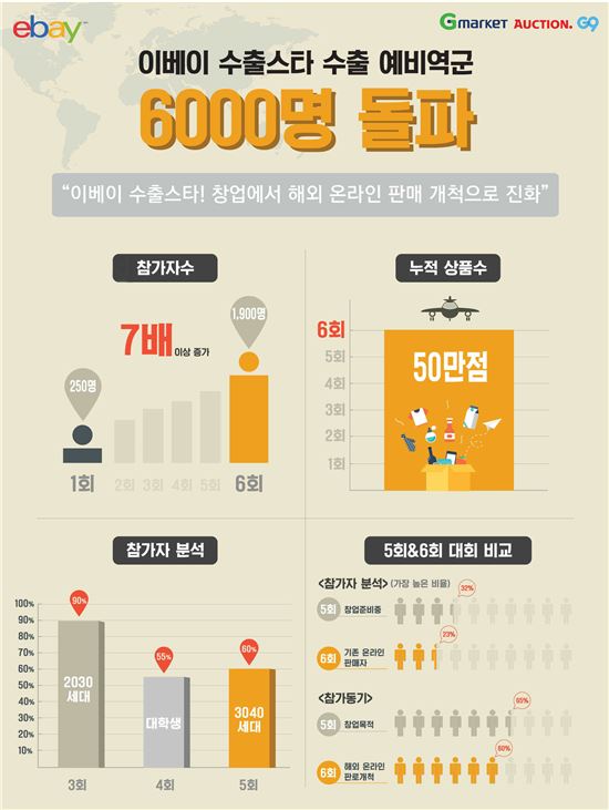 [아시아경제 지연진 기자]온라인쇼핑몰 G마켓과 옥션, G9를 운영하는 이베이코리아는 지난 6년간 ‘이베이 수출스타’ 참가자가 6000명을 돌파했다고 8일 밝혔다.