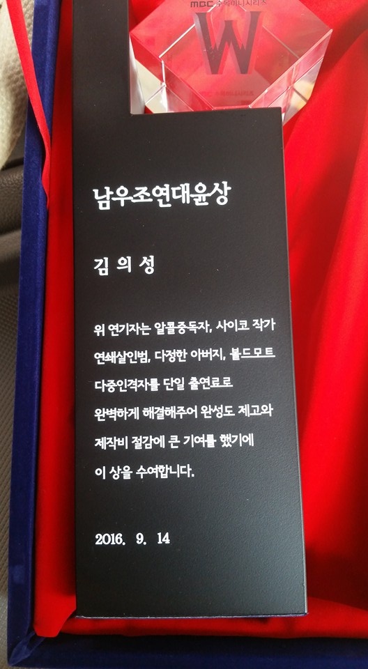 ‘남우조연대윤상’은 ‘W’ 속 김의성의 활약에 대한 제작진의 감사함을 담아 직접 제작한 트로피다. 트로피에는 “위 연기자는 알콜중독자, 사이코 작가, 연쇄 살인범, 다정한 아버지, 볼드모트 다중인격자를 단일 출연료로 완벽하게 해결해주어 완성도 제고와 제작비 절감에 큰 기여를 했기에 이 상을 수여합니다”라고 적혀있다.
