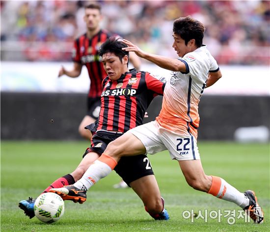 [아시아경제 김현민 기자]프로축구 FC서울과 제주 유나이티드의 2016 K리그 클래식 경기가 18일 서울월드컵경기장에서 열렸다. 제주 이근호가 서울 김남춘과 공을 다투고 있다.