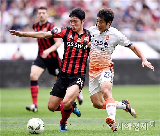 [아시아경제 김현민 기자]프로축구 FC서울과 제주 유나이티드의 2016 K리그 클래식 경기가 18일 서울월드컵경기장에서 열렸다. 제주 이근호가 서울 김남춘과 공을 다투고 있다.
