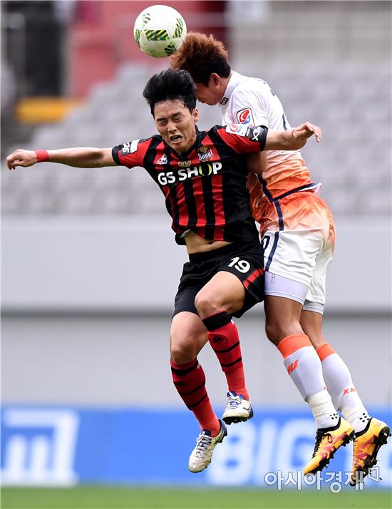 [아시아경제 김현민 기자]프로축구 FC서울과 제주 유나이티드의 2016 K리그 클래식 경기가 18일 서울월드컵경기장에서 열렸다. 서울 윤주태가 제주 이광선과 공중볼을 다투고 있다.