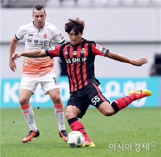 [아시아경제 김현민 기자]프로축구 FC서울과 제주 유나이티드의 2016 K리그 클래식 경기가 18일 서울월드컵경기장에서 열렸다. 서울 곽태휘가 수비 진영에서 공을 걷어내고 있다.