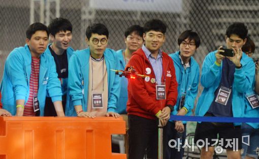 [아시아경제 문호남 인턴기자] 19일 서울 송파구 올림픽공원 SK 핸드볼 경기장에서 열린 '서울 모빌리티 해커톤'에서 참가자들이 김민찬 선수의 드론 시범을 관람하고 있다.