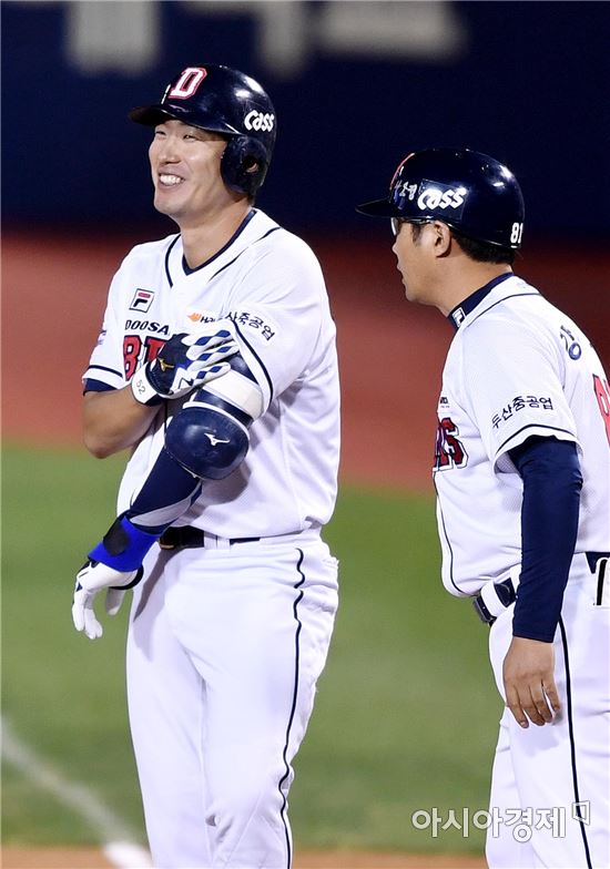 [아시아경제 김현민 기자]프로야구 삼성 라이온즈와 두산 베어스의 2016 KBO리그 경기가 20일 잠실구장에서 열렸다. 2회말 1사 2,3루에서 두산 김재호가 추가 2타점 적시타를 치고 미소짓고 있다.