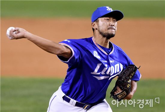 [아시아경제 김현민 기자]프로야구 삼성 라이온즈와 두산 베어스의 2016 KBO리그 경기가 20일 잠실구장에서 열렸다. 5회말 삼성 선발 정인욱에 이어 마운드에 오른 권오준이 역투하고 있다.