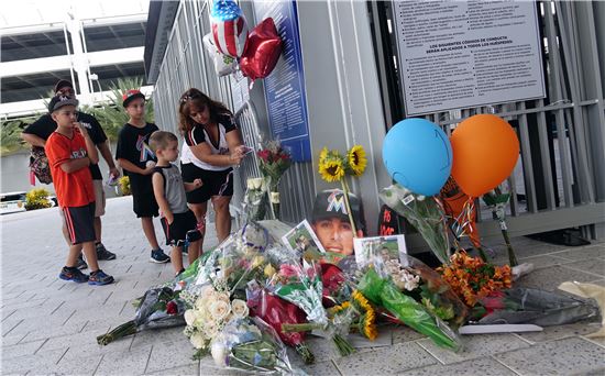 [아시아경제 이지은 기자]미국 프로야구 메이저리그 마이애미 말린스의 우완투수 호세 페르난데스가 25일(현지시간) 보트사고로 사망했다. 팬들이 마이애미 말린스 파크의 경기장 앞에 꽃과 풍선 등을 두며 그를 추모하고 있다.