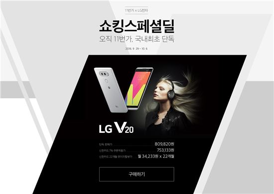 [아시아경제 지연진 기자]SK플래닛 11번가가 다음달 6일까지 LG전자 최신 스마트폰 V20 무약정폰을 오픈마켓 단독 판매한다.