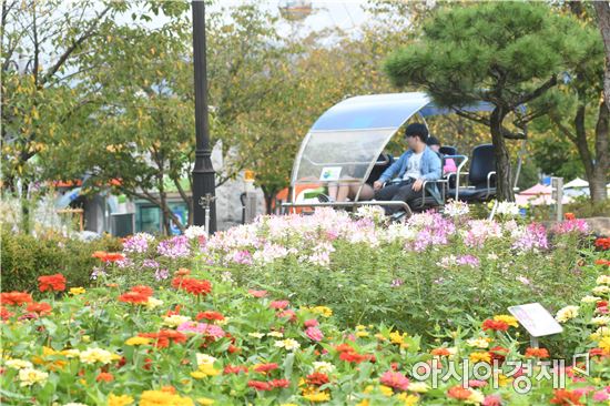 [아시아경제 노해섭 기자]개천절 연휴 첫날인 1일 가을비가 오락가락 내리는 가운데 곡성심청축제가 열리고 있는 섬진강기차마을 찾은 관광객들이 코스모스와 가을꽃 향기를 맡으면서 레일바이크를 타고 있다.