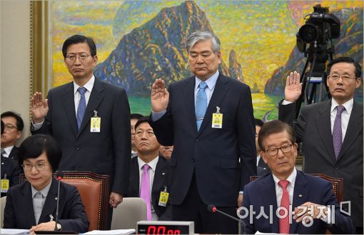 [아시아경제 윤동주 기자] 4일 국회 정무위원회의 산업은행 등에 대한 국정감사에 증인신분으로 출석한 석태수 한진해운 사장(왼쪽부터), 조양호 한진그룹 회장, 신대식 전 대우조선해양 감사실장이 증인선서를 하고 있다.