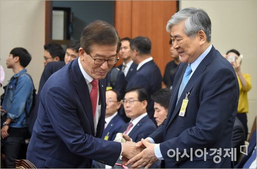 [아시아경제 윤동주 기자] 조양호 한진그룹 회장이 4일 국회 정무위원회의 산업은행 등에 대한 국정감사에 증인신분으로 출석, 이동걸 산업은행장과 인사를 나누고 있다.