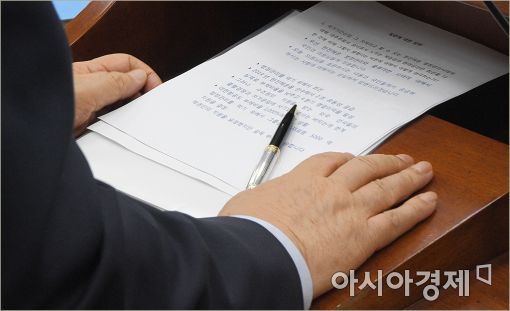 [아시아경제 윤동주 기자] 조양호 한진그룹 회장이 4일 국회 정무위원회의 산업은행 등에 대한 국정감사에 증인신분으로 출석, 미리 준비해온 답변자료를 보고 있다.