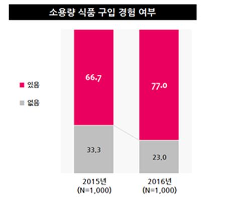 실제 소용량 식품의 구매는 과거에 비해 많아진 것으로 나타났다.전체 응답자의 77%가 소용량 식품을 구입해 본 경험을 가지고 있었다. 이는 2015년 조사(66.7%)에 비해 크게 증가한 수치다. 그만큼 소용량 식품에 대한 니즈가 높아진 것으로, 남성(74.4%)보다는 여성(79.6%), 30대 소비자(20대 78.4%, 30대 83.2%, 40대 74.8%, 50대 71.6%)의 구입 경험이 보다 많은 편이었다.