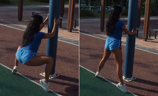 동영상 속 정아름은 꿀벅지가 드러나는 짧은 팬츠를 입고 힙업과 다리라인에 효과적인 운동 동작을 선보이고 있다.