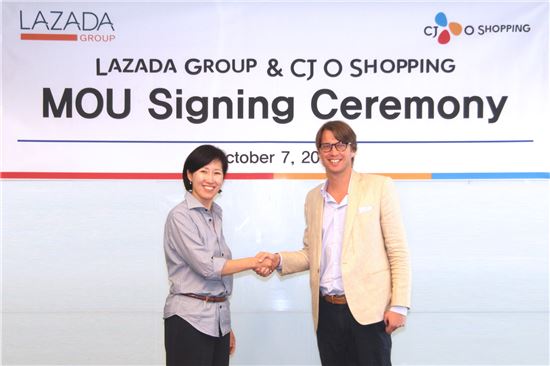 CJ오쇼핑은 지난 7일 오전 11시 서울 서초구 방배동 사옥에서 진정임 미래성장본부 부사장과 스타인 야콥 오이야(Stein Jakob Oeie) 라자다 그룹 부회장이 참석한 가운데 업무 협약 체결식을 갖고 동남아시아 6개국에서 운영 중인 글로벌 온라인몰 라자다에 숍인숍 형태의 'CJ몰 브랜드관'을 열기로 합의했다.