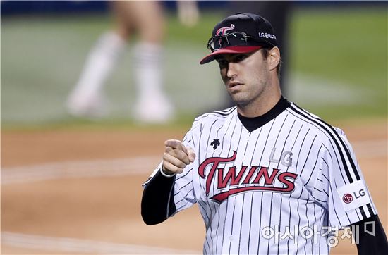 [아시아경제 김현민 기자]프로야구 KIA 타이거즈와 LG 트윈스의 2016 KBO 포스트시즌 와일드카드 결정 1차전10일 잠실구장에서 열렸다. LG 선발 허프가 2회말 2사에서 KIA 김호령의 타구를 처리한 3루수 히메네스를 향해 손짓하고 있다.
