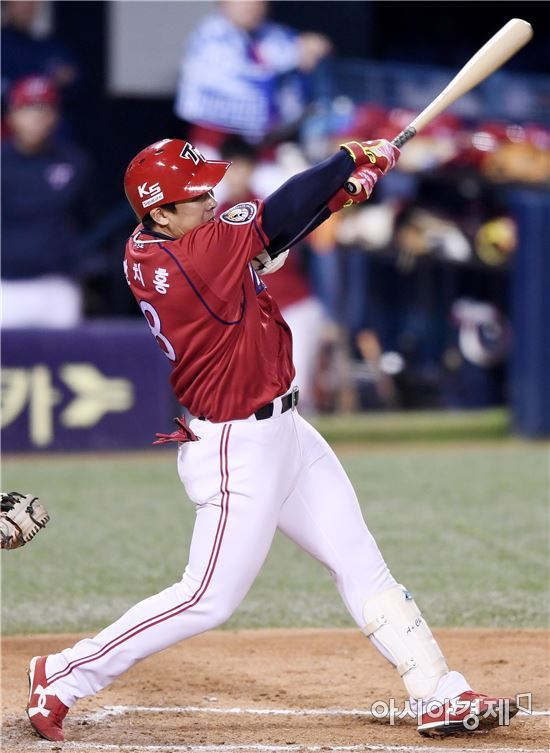 [아시아경제 김현민 기자]프로야구 KIA 타이거즈와 LG 트윈스의 2016 KBO 포스트시즌 와일드카드 결정 1차전이 10일 잠실구장에서 열렸다. 4회초 2사 2,3루에서 KIA 안치홍이 선취 2타점 적시타를 치고 있다.