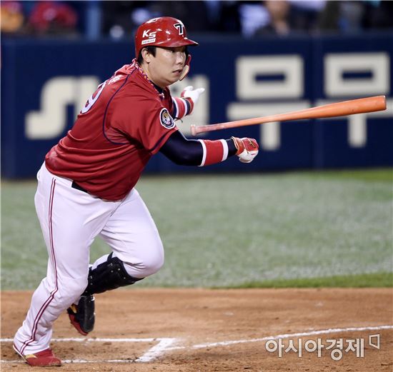 [아시아경제 김현민 기자]프로야구 KIA 타이거즈와 LG 트윈스의 2016 KBO 포스트시즌 와일드카드 결정 1차전이 10일 잠실구장에서 열렸다. 4회초 1사 1루에서 KIA 나지완이 우익수 옆 2루타를 치고 있다.