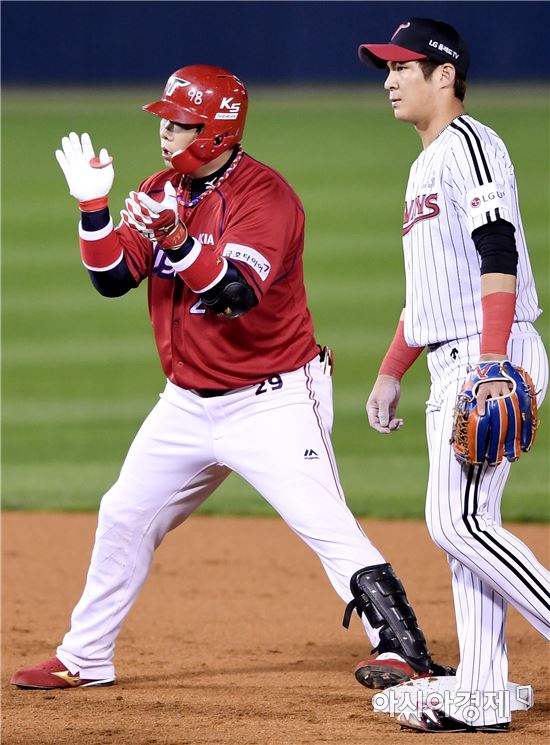 [아시아경제 김현민 기자]프로야구 KIA 타이거즈와 LG 트윈스의 2016 KBO 포스트시즌 와일드카드 결정 1차전이 10일 잠실구장에서 열렸다. 4회초 1사 1루에서 KIA 나지완이 우익수 옆 2루타를 치고 출루한 뒤 박수치고 있다. LG 유격수는 오지환.