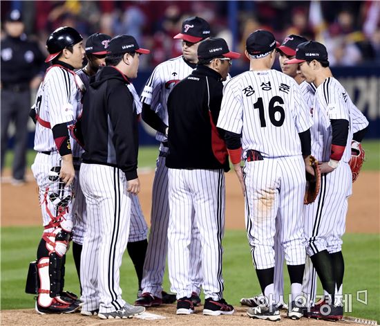 [아시아경제 김현민 기자]프로야구 KIA 타이거즈와 LG 트윈스의 2016 KBO 포스트시즌 와일드카드 결정 1차전이 10일 잠실구장에서 열렸다. LG 양상문 감독이 4회초 2사 2루의 위기에서 LG 양상문 감독이 마운드에 올라 선수들을 격려하고 있다.