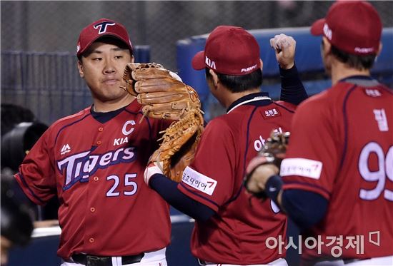 [아시아경제 김현민 기자]프로야구 KIA 타이거즈와 LG 트윈스의 2016 KBO 포스트시즌 와일드카드 결정 2차전이 11일 잠실구장에서 열렸다. 3회말 2사 2,3루에서 KIA 3루수 이범호가 LG 박용택의 파울타구를 호수비로 잡아낸 뒤 동료들과 하이파이브하고 있다.
