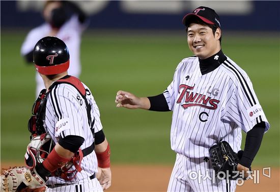 [아시아경제 김현민 기자]프로야구 KIA 타이거즈와 LG 트윈스의 2016 KBO 포스트시즌 와일드카드 결정 2차전이 11일 잠실구장에서 열렸다. LG 선발 류제국이 4회초 마운드를 방문한 정상호 포수를 바라보며 미소 짓고 있다.