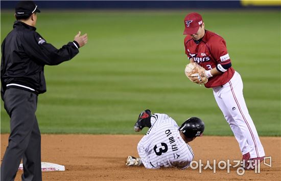 [아시아경제 김현민 기자]프로야구 KIA 타이거즈와 LG 트윈스의 2016 KBO 포스트시즌 와일드카드 결정 2차전이 11일 잠실구장에서 열렸다. 4회말 무사 1루에서 KIA 김선빈이 LG 오지환의 2루수 땅볼 때 1루주자 히메네스를 포스아웃 시키고 있다.
