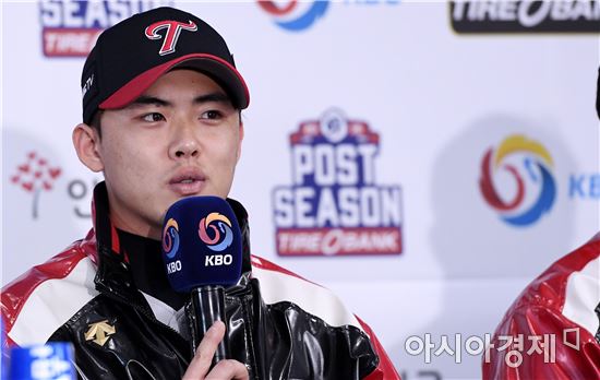 [아시아경제 김현민 기자]프로야구 LG와 넥센의 2016 KBO 포스트시즌 준플레이오프 미디어데이가 12일 고척돔에서 열렸다. LG 임정우가 각오를 말하고 있다.