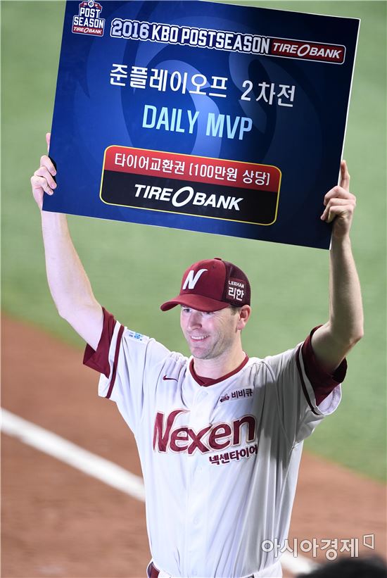 [아시아경제 김현민 기자]프로야구 LG 트윈스와 넥센 히어로즈의 2016 KBO 포스트시즌 준플레이오프 2차전이 14일 고척스카이돔에서 열렸다. 7.2이닝 1실점으로 넥센의 5-1 승리를 이끈 넥센의 선발투수 밴헤켄이 데일리 MVP를 수상하고 있다.