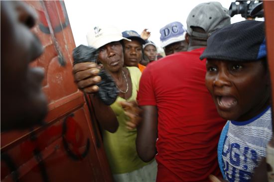 [아시아경제 이지은 기자]허리케인 매슈에 강타당한 아이티 레카예에서 이재민들이 17일(현지시간) 시장 집무실 측에 항의하고 있다. 전날 진행되기로 했던 식량배급이 지연되면서 이재민들의 분노가 커지고 있는 상태다. 유엔 인도지원조정국에 따르면 매슈 피해로 아이티에 최소 1억2000만달러(약 1340억원) 상당의 긴급 구호가 필요한 것으로 밝혀졌다.
