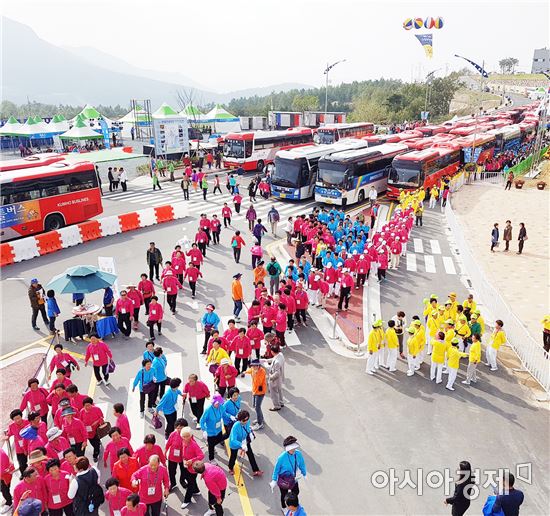 [아시아경제 노해섭 기자]18일 전남 노인건강증진사업 경연대회에 참석한 1300명의 인파와 이들을 태운 버스가 장흥국제통합의학박람회장을 가득 메웠다. 박람회가 개최 중반을 넘어선 가운데 학교와 기관·사회단체의 단체관람객이 꾸준히 이어지며 방문객 증가세에 힘을 싣고 있다.