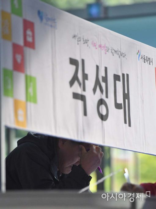 [아시아경제 백소아 기자] 18일 서울 서초구 서초구청에서 열린 2016 서울시 찾아가는 취업박람회에서 한 구직자가 이력서를 작성하다 고민하고 있다.