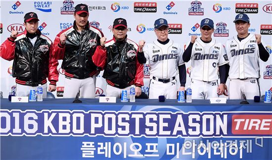 [아시아경제 김현민 기자]프로야구 2016 KBO 포스트시즌 플레이오프 미디어데이가 20일 마산종합운동장 올림픽기념관에서 열렸다. 양 팀 선수들이 파이팅을 외치고 있다. 왼쪽부터 유강남, 이동현, 양상문 감독(이상 LG), 김경문 감독, 이종욱, 김태군(이상 NC).