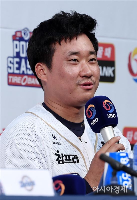 [아시아경제 김현민 기자]프로야구 2016 KBO 포스트시즌 플레이오프 미디어데이가 20일 마산종합운동장 올림픽기념관에서 열렸다. NC 김태군이 각오를 말하고 있다.