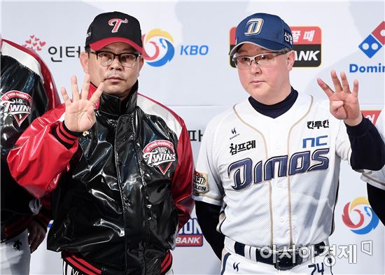 [아시아경제 김현민 기자]프로야구 2016 KBO 포스트시즌 플레이오프 미디어데이가 20일 마산종합운동장 올림픽기념관에서 열렸다. LG 양상문 감독(왼쪽)과 NC 김경문 감독이 예상 차전 수를 손가락으로 들어보이고 있다.