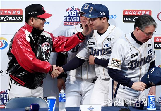 [아시아경제 김현민 기자]프로야구 2016 KBO 포스트시즌 플레이오프 미디어데이가 20일 마산종합운동장 올림픽기념관에서 열렸다. LG 양상문 감독이 NC 김태군의 얼굴을 쓰다듬고 있다.